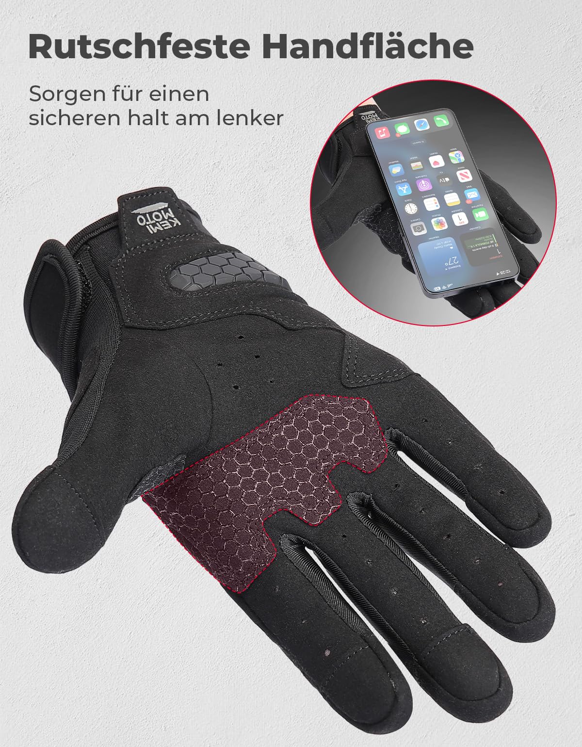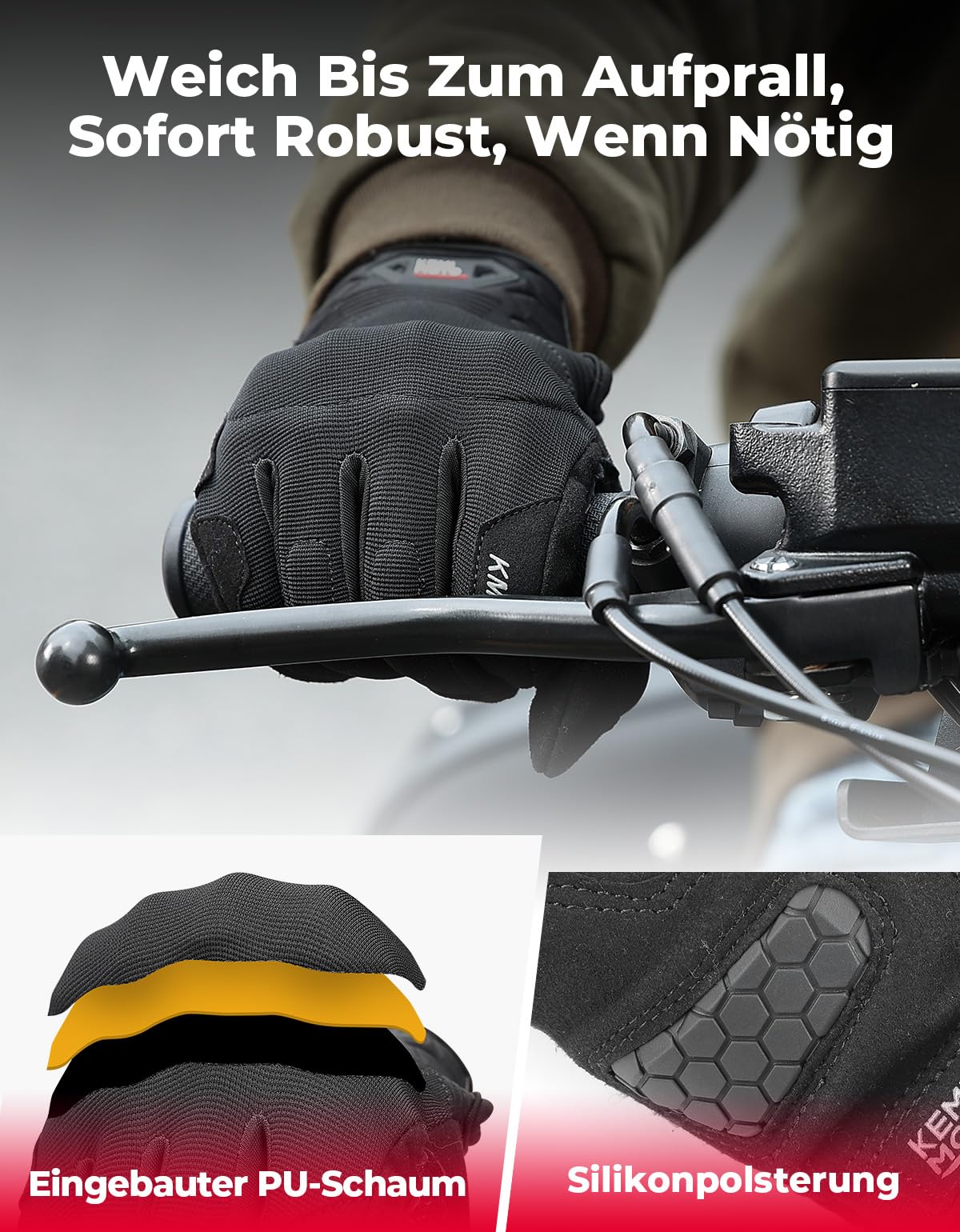 - Mousse en polyuréthane pour la protection et le confort : les chevilles et les articulations de ces gants de moto KEMIMOTO pour homme sont équipées de mousse PU souple qui durcit immédiatement en cas d'impact. Cela offre une protection supérieure et une absorption des chocs, tandis que la mousse redevient douce par la suite. Parfait pour une conduite sûre et confortable.