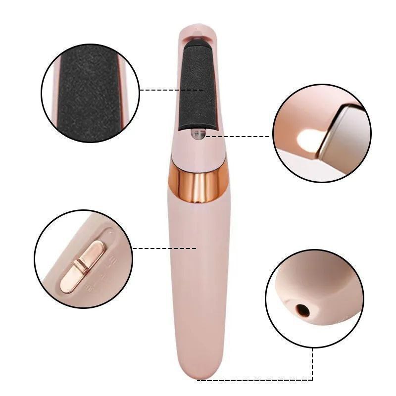 Sleek et féminin, cet outil est doté d'une lumière LED intégrée qui illumine votre pied, vous garantissant de ne manquer aucun endroit. Il propose deux vitesses pour un confort d'utilisation optimal et comprend deux rouleaux : un fin pour l'exfoliation de la peau sèche et un grossier pour l'élimination des callosités et de la peau rugueuse, prêt pour le soin nécessaire.
