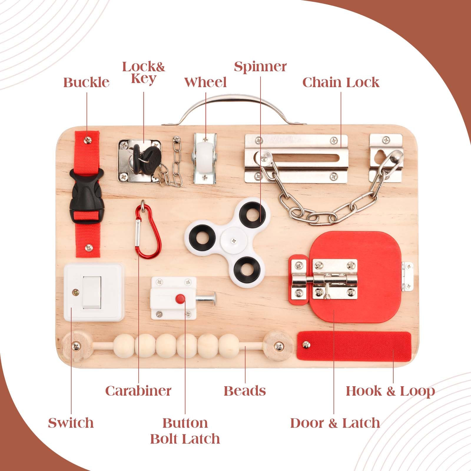 - Restez détendu : le Fidget Board améliore le bien-être des personnes atteintes de démence en répondant à leur besoin de rester occupés et engagés. Il les aide à se sentir plus calmes et plus détendus en leur offrant des activités amusantes.