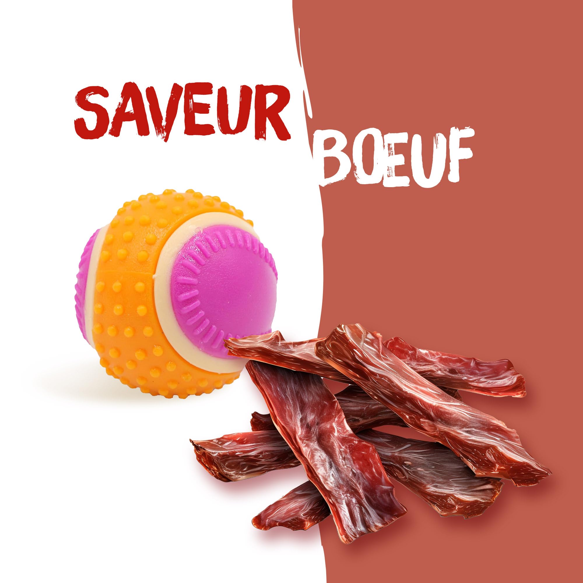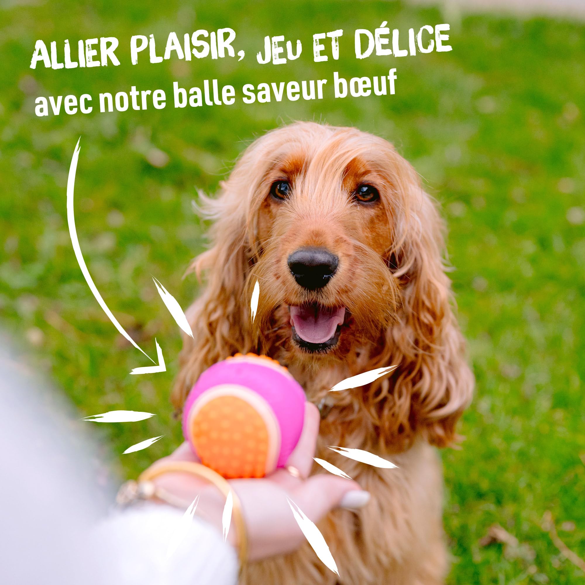 - [Développer les sens] Gourmand par nature, les chiens ont un odorat et un goût très développés. Avec sa saveur bœuf, cette balle pour chiens va titiller ses papilles et lui donner envie de jouer avec vous. Grâce à ses couleurs vives, votre chien pourra repérer de loin sa balle préférée.