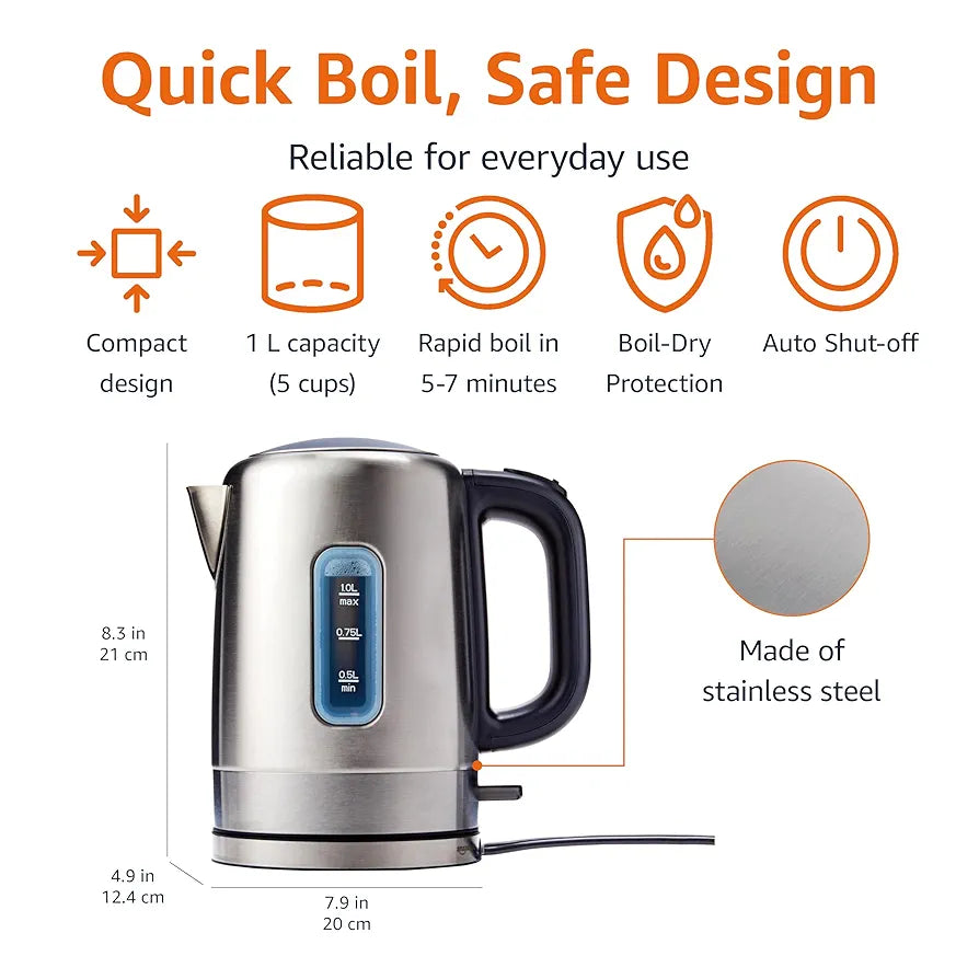 Amazon Basics Electric Stainless Steel Kettle for Tea and Coffee, BPA-Free, Fast Boiling, Auto Shut-Off, 1.1 Quarts, 1500W, Black and Silver